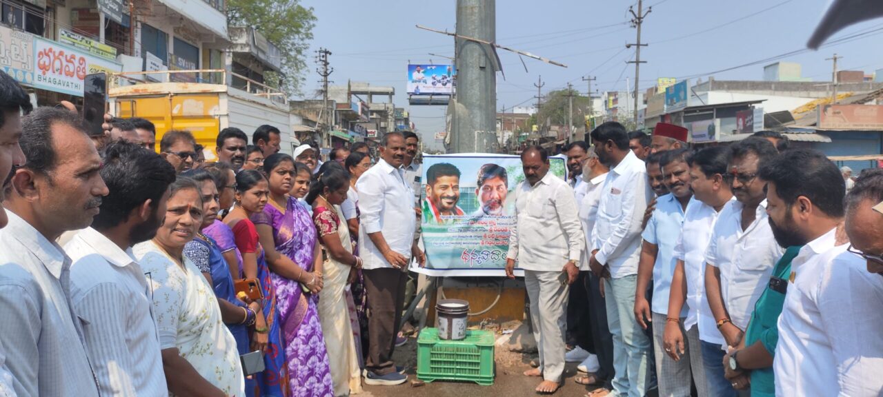 ముఖ్యమంత్రి, ఉపముఖ్యమంత్రి, ఎమ్మెల్యే చిత్రపటాలకు పాలాభిషేకం నిర్వహిస్తున్న కాంగ్రెస్ నాయకులు